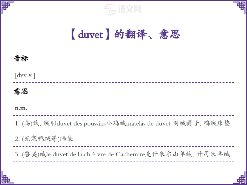 1. (鸟)绒, 绒羽duvet des poussins小鸡绒matelas de duvet 羽绒褥子, 鸭绒床垫