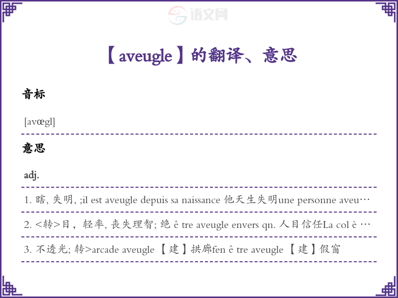 【aveugle】 词源: 形容词变化: 名词变化: 副词变化: 近义词: 反义词: 联想词