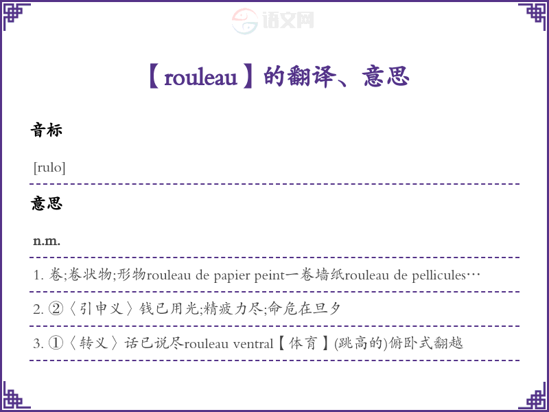1. 卷;卷状物;形物rouleau de papier peint一卷墙纸rouleau de pellicules photographiques胶卷donner un rouleau à développer交一卷胶片rouleau de printemps春卷être au bout de son rouleau