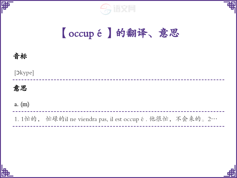 1. 1忙的, 忙碌的il ne viendra pas, il est occupé. 他很忙,不会来的。2占用的; (电话线等)有人正在使用的; (座位、饭桌)有人预订的3占领的territoires occupés 占领的领土