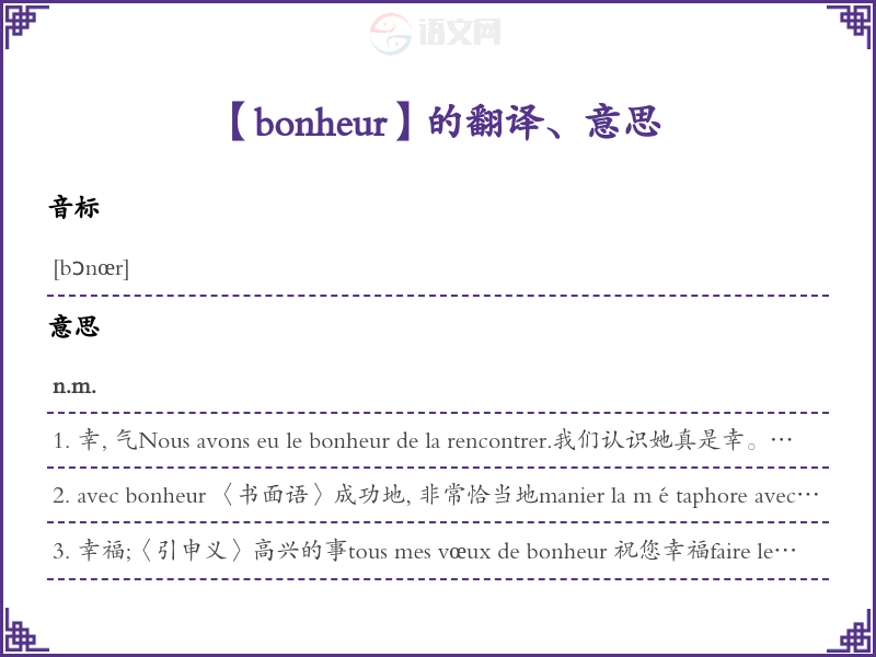 1. 幸, 气Nous avons eu le bonheur de la rencontrer.我们认识她真是幸。porter bonheur 带Tu ne connais pas ton bonheur .你真是身在福中不知福。