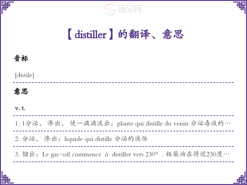 1. 1分泌, 渗出, 使一滴滴流出:plante qui distille du venin 分泌毒液的植物2 [转]散发出, 散布:distiller l'ennui 令人厌倦3蒸馏:purifier de l'eau en la distillant 蒸馏的办法来净化水distiller du bois 干溜木材4[书]酿出(液汁):L'abeille distille le miel. 蜜蜂酿蜜。5[转]使…精练:distiller ses pensées 使思想精练v. i.