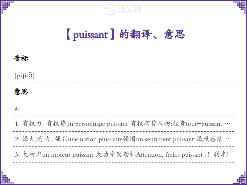 2. 强大;有力, 强烈une nation puissante强国un sentiment puissant 强烈感情un vent puissant 大风une voix puissante强有力声音une puissante armée一支强大军队