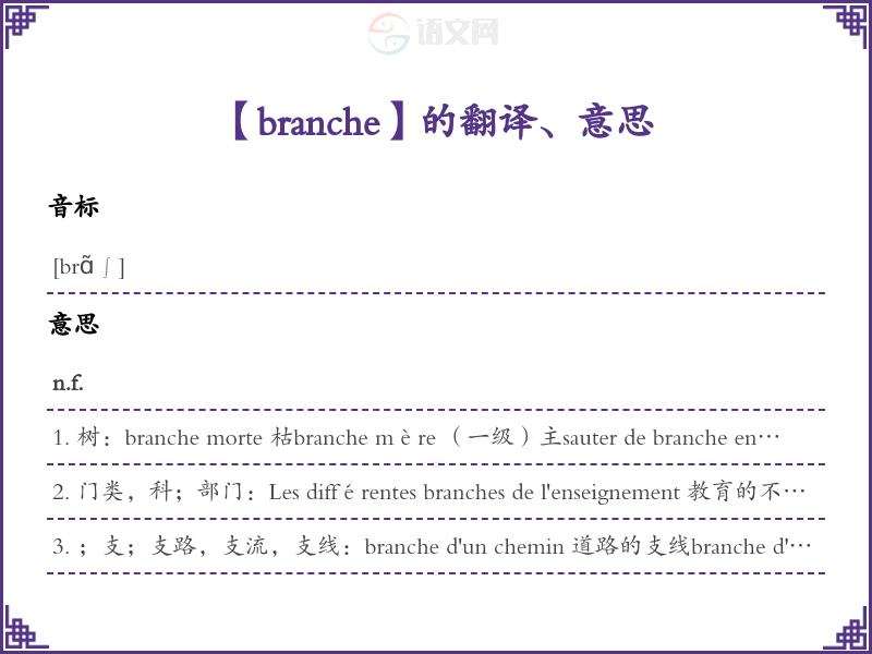 3. ;支;支路,支流,支线:branche d'un chemin 道路的支线branche d'un chandelier 烛台的les branches d'une racine 部的