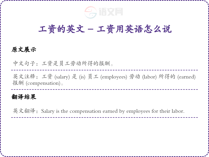 英文注释:工资 (salary) 是 (is) 员工 (employees) 劳动 (labor) 所得的 (earned) 报酬 (compensation)。