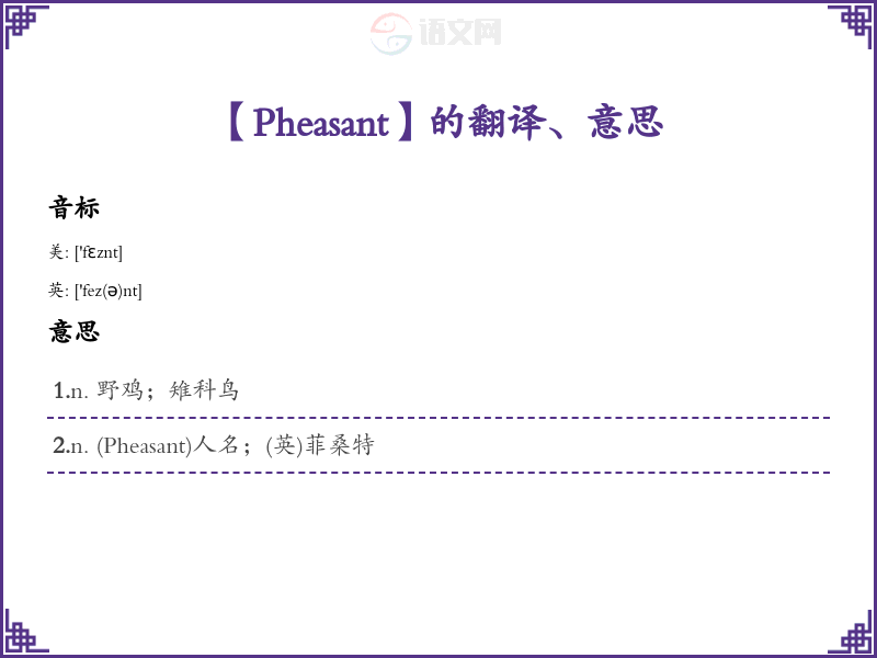 - 字面意思:Pheasant 是一种大型的鸟类,通常具有鲜艳的羽毛,多见于森林和草原。它们是受欢迎的猎物和食品。