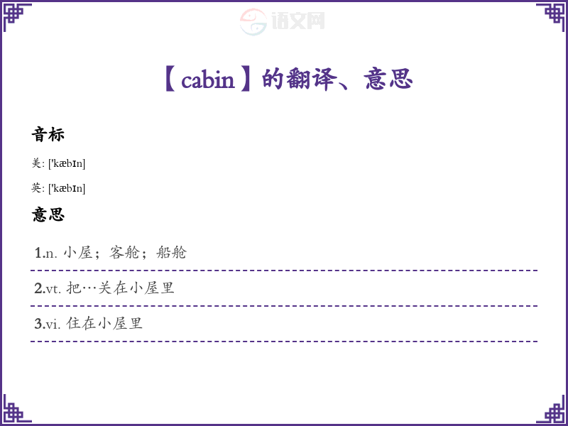 - Cabin 的音标是 /ˈkæb.ɪn/,可以通过分音节来记忆:’cab’(出租车)+ ‘in’(在里面),想象一个出租车司机在他的车里休息。