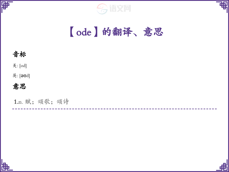 - 词源分析:Ode 源自希腊文“ōdē”,意为“歌”或“歌曲”。它由希腊语的词根“ōd-”构成,表示与音乐或歌唱相关的概念。
