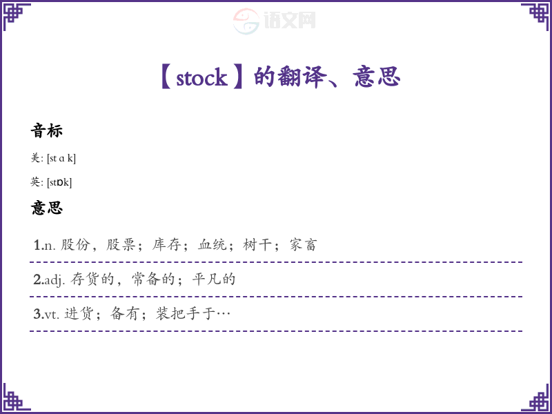 stock这个词的字面含义是“库存”或“储备”,通常指企业或商店中可供销售的商品或物资。 - 词性:名词(noun)、动词(verb)。