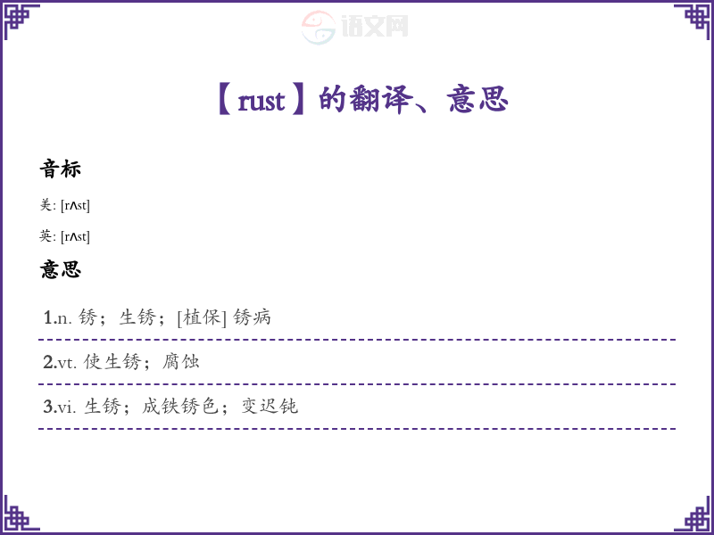 音标记忆法:Rust /rʌst/。可以将这个音节与“生锈”的情景联系在一起,通过反复朗读来加强记忆。