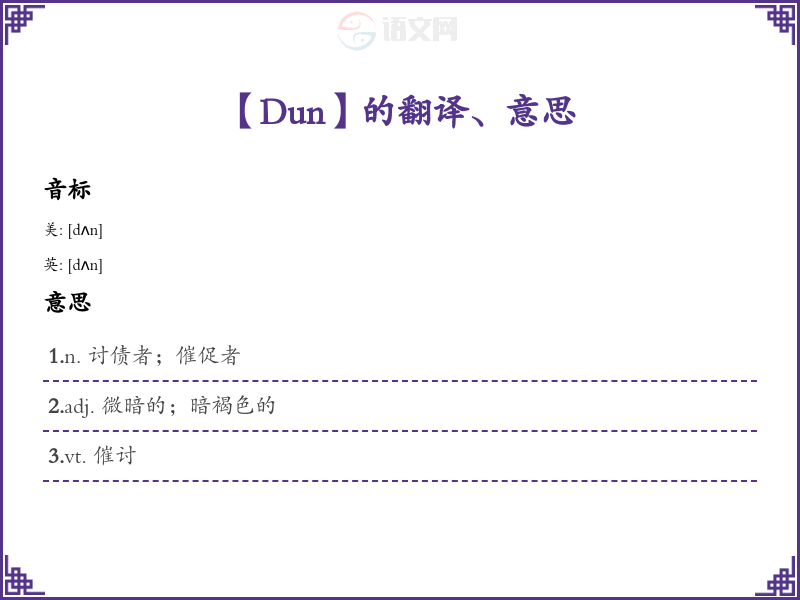 通过上述的分析,可以更全面地理解和运用单词Dun。希望这些信息对你的学*有所帮助!