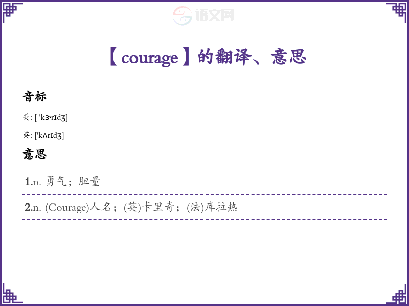 - 字面意思:courage 一词字面上指的是“勇气”或“胆量”。它指的是面对困难、危险或痛苦时表现出的勇敢和决心。