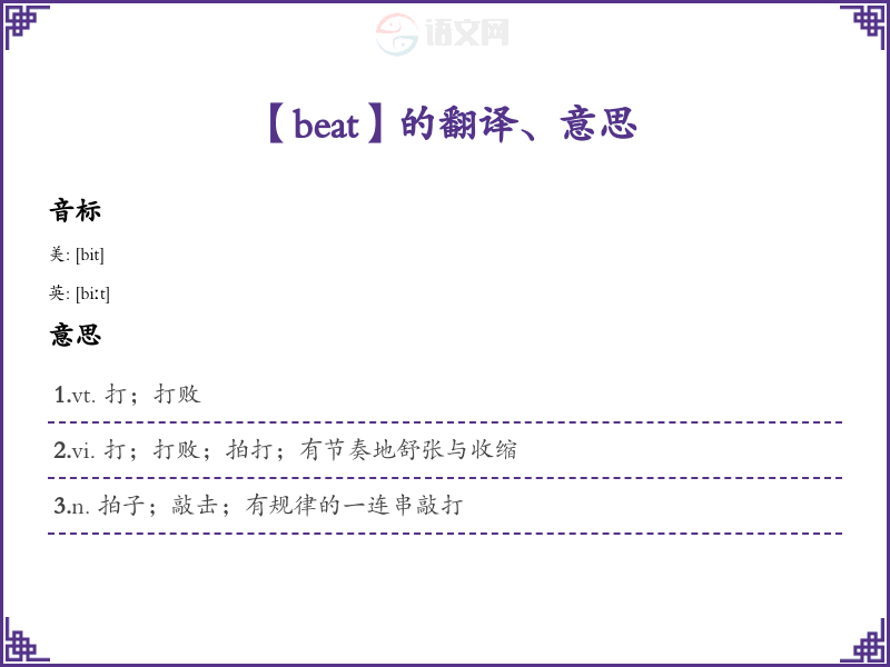- 字面意思:动词“beat”指用力量或快速的动作打击、敲击某物;名词“beat”指打击的声音或节奏。