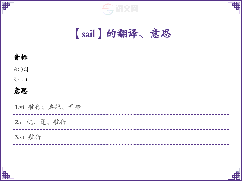 音标记忆法:sail的音标为/sāl/,可以将其与“sale”(销售)联想,想象着在海上航行的时候进行交易。