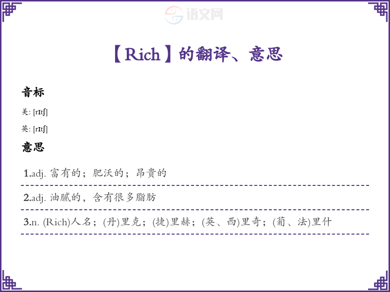 - 字面意思:Rich的字面含义是“富有的”,通常用来形容拥有大量财物、资源或财富的人或事物。