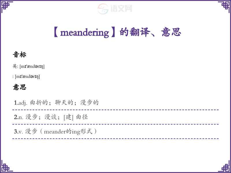 - 词性:形容词(meandering)和名词(meander)。