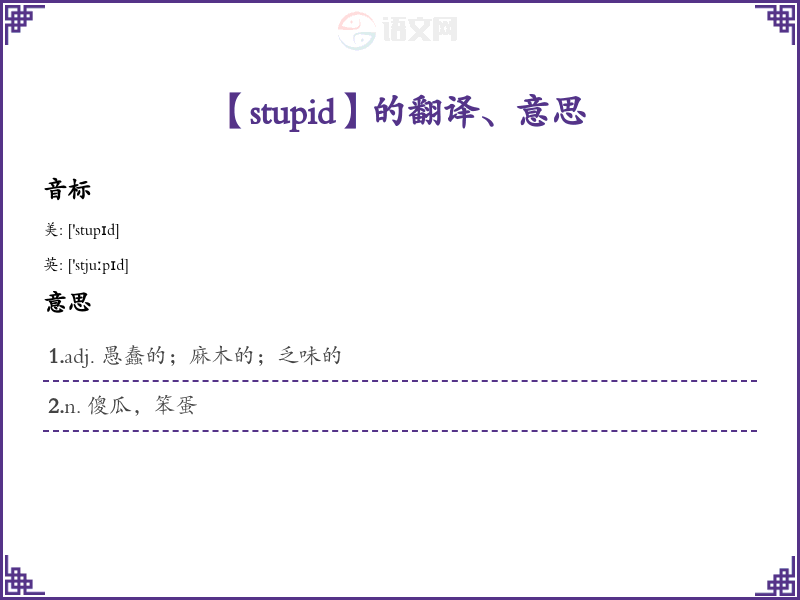 - 谐音联想记忆:可以将“stupid”联想为“死呆”,即“死”代表愚蠢,“呆”代表无知。