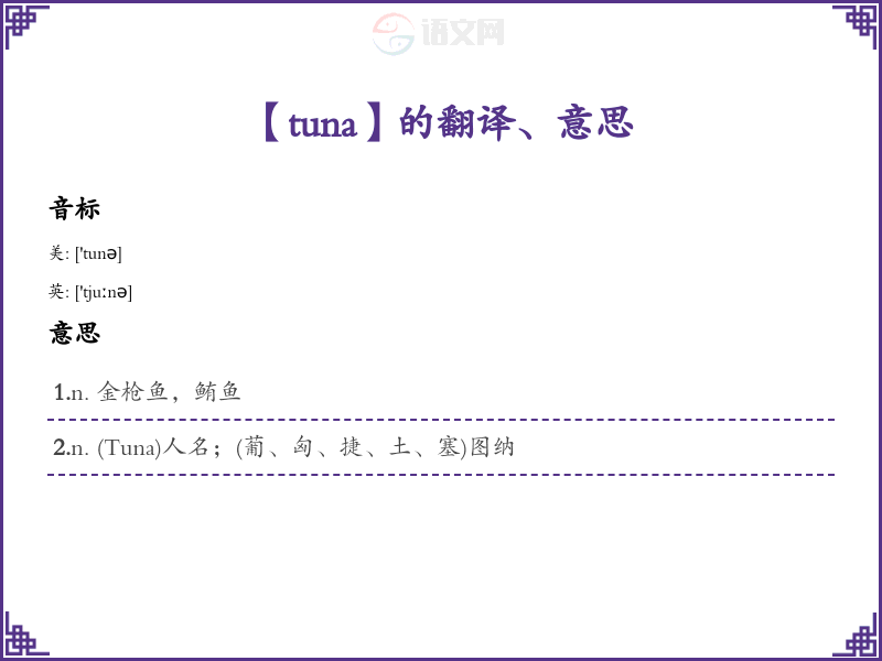 - 音标记忆法:tuna的音标是 /ˈtuː.nə/。可以通过发音练*来加深记忆,尝试重复几遍。