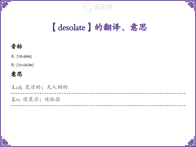 - 词源分析:Desolate 源于拉丁语“desolatus”,意为“被遗弃的”,由前缀“de-”(表示“去掉”或“反向”)和“solare”(意为“安慰”)组成。整体上可以理解为“失去安慰”。