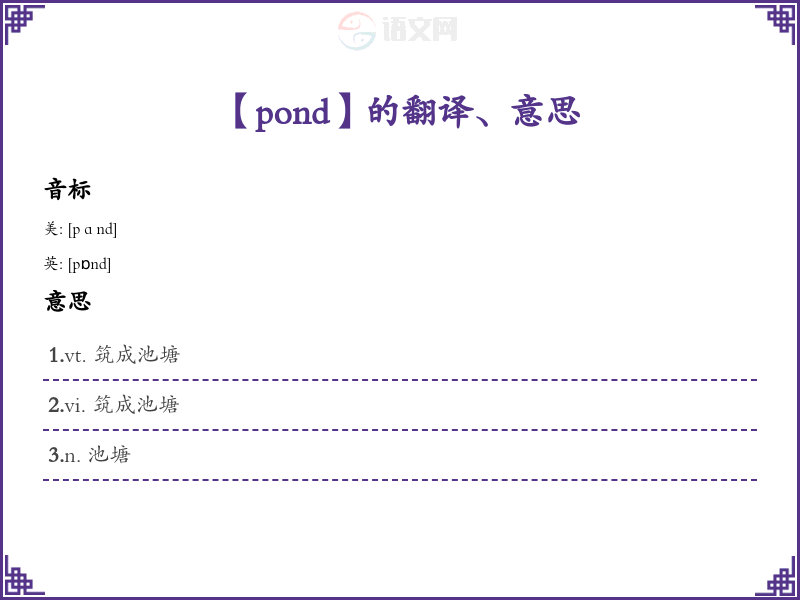 - 在**的教材中,pond通常出现在小学或初中英语课本中,作为自然环境相关的词汇。