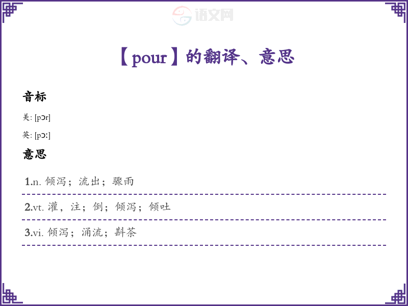词源分析:Pour源自拉丁语“pōrāre”,意为“倾倒、流出”。词根“pour”与其在古法语中的形式“porrer”相关联,意指“倾倒”或“流出”。