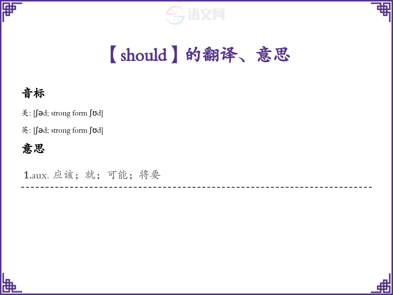 - "Should" 是一个情态动词,用来表示建议、义务、期望或推测。