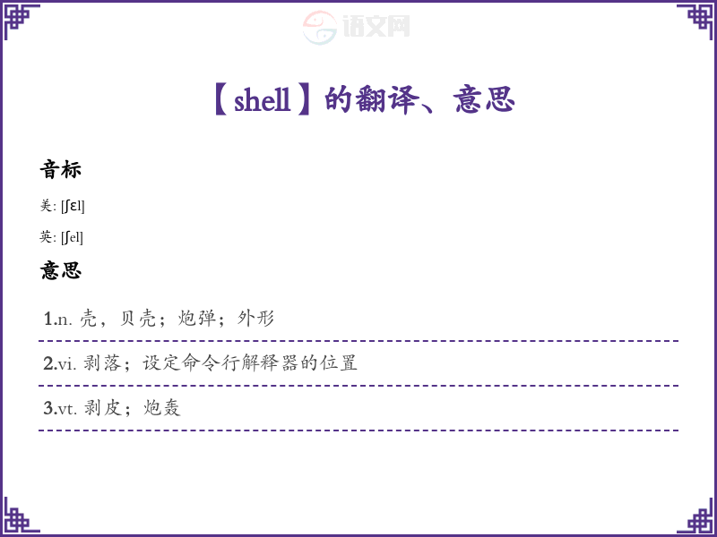 - 记住“shell”的词根“sceall”,可以联想到与保护和外部覆盖相关的事物,如“保护壳”、“外壳”等。通过联想相似的词汇(如“case”、“husk”)来加深理解。
