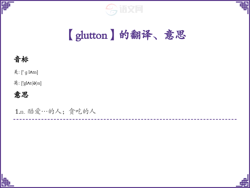 音标记忆法:发音 [ˈɡlʌtən] 可以通过分解音节来记忆,glut(贪吃)+ ton(吨),可以联想成“吞下很多”的感觉。