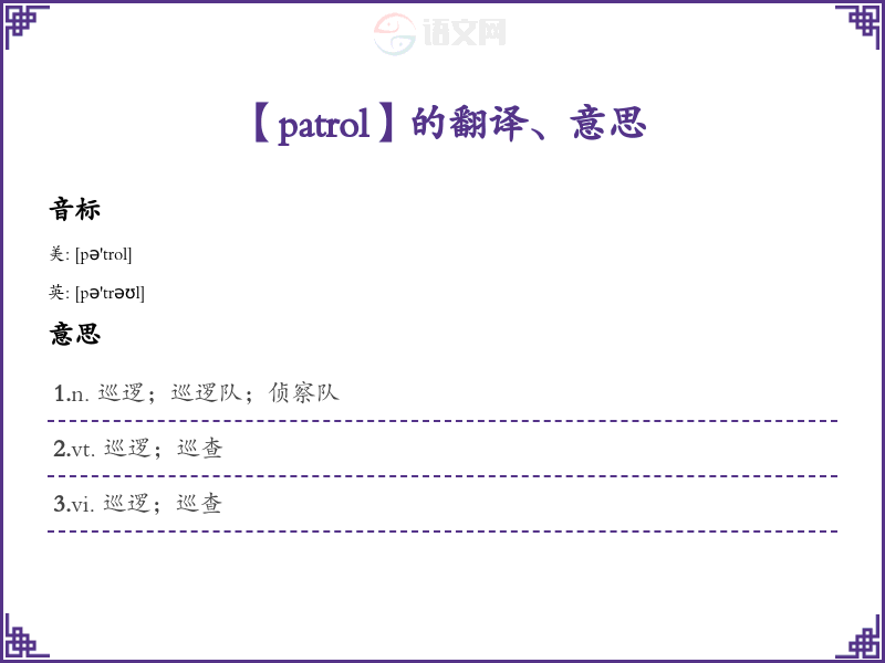 - 词根记忆法:可以将“patrol”拆分为“pat”(指引)和“rol”(轮)来联想,理解其原意是指引导或巡视某个区域。