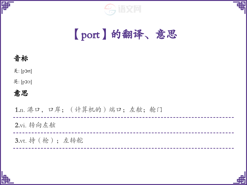- 音标记忆法:使用音标/ pɔrt /,可以联想“port”与“portals”(入口)的发音相似,帮助记忆。