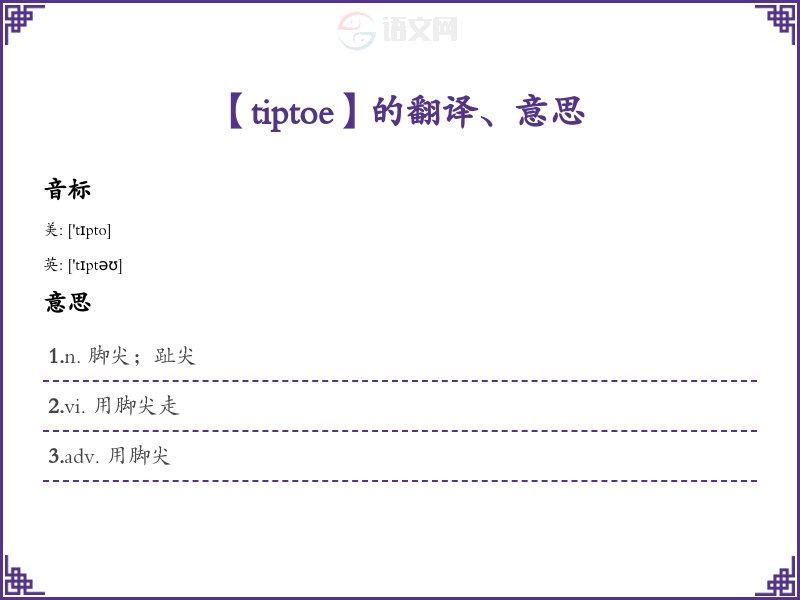 - 定义:作为动词时,意指“轻声走,踮着脚尖走”;作为名词,意指“脚尖”。