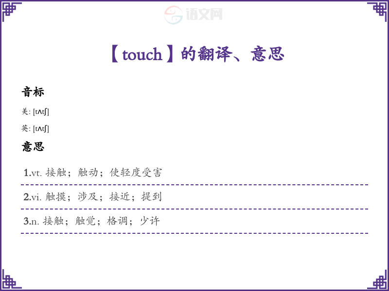 touch指的是用手或其他物体轻轻接触某物。它也可以引申为影响某人的情感或状态。 - 词性:动词(verb)、名词(noun)。