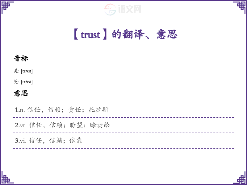 - 字面意思:信任;信赖。该单词指的是对某人或某事的信心,通常基于以往的经验或信念。