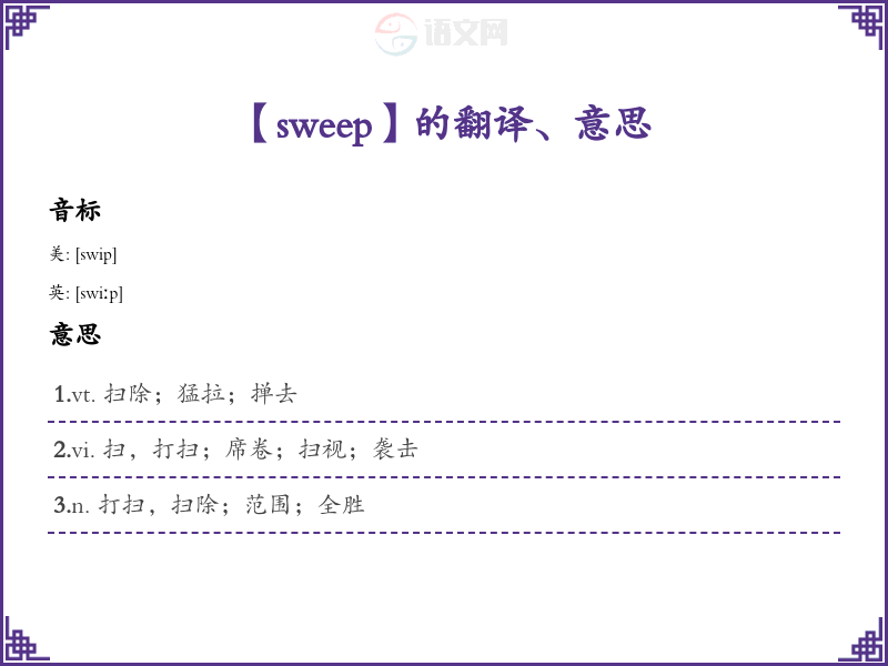 - 音标记忆法:/swiːp/,可以将其分为“swee”和“p”,联想为“sweet”(甜的)和“peep”(窥视),帮助记忆发音。