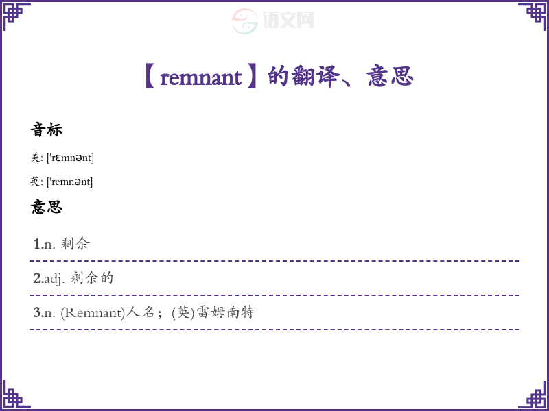 - “remnant” 的音标为 /ˈrɛm.nənt/。可以通过分解音节来记忆: