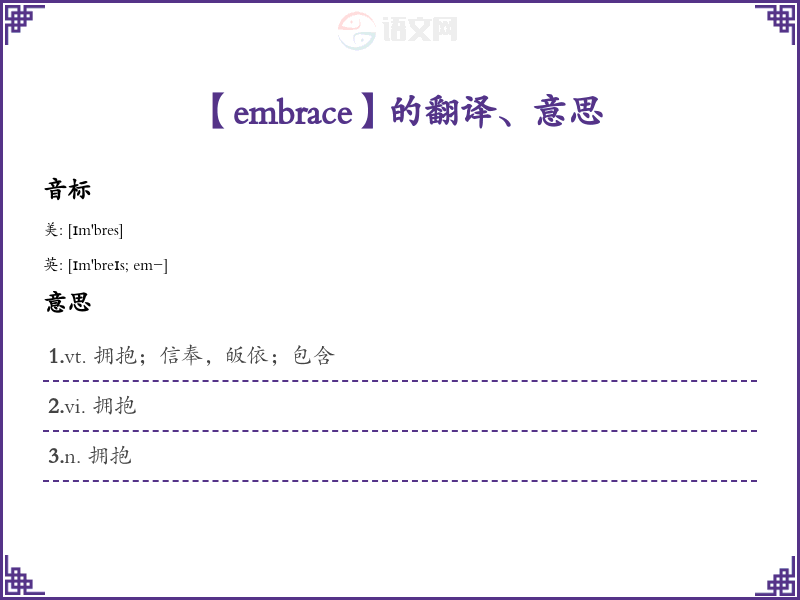 - 字面意思:字面上,“embrace”意指“拥抱”,可以指身体上的拥抱或比喻意义上的接纳。定义为“紧紧抱住或接受某人或某事”。