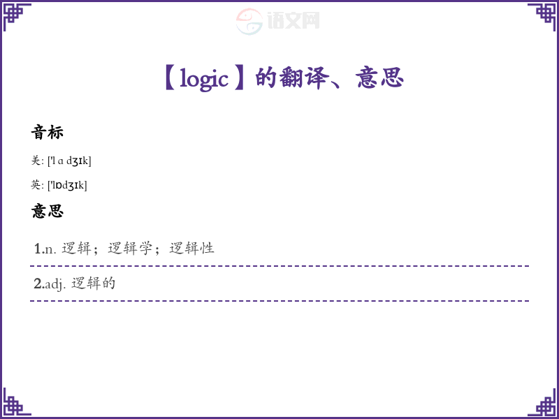 - 学*发音 /ˈlɒdʒɪk/,可以帮助记住这个词。试着将这个音与“逻辑”的发音联系起来。