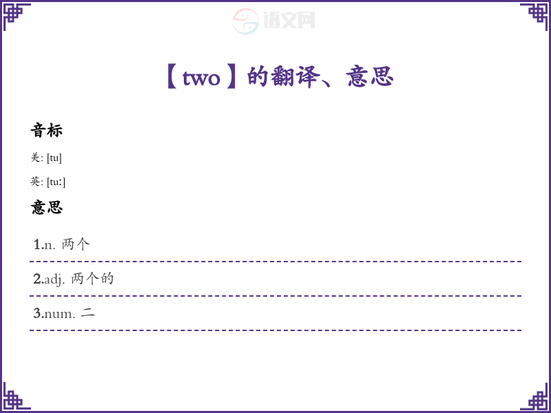 - 音标记忆法:利用“two”的音标/tuː/,可以联想到“too”,“也”的意思,帮助记忆。