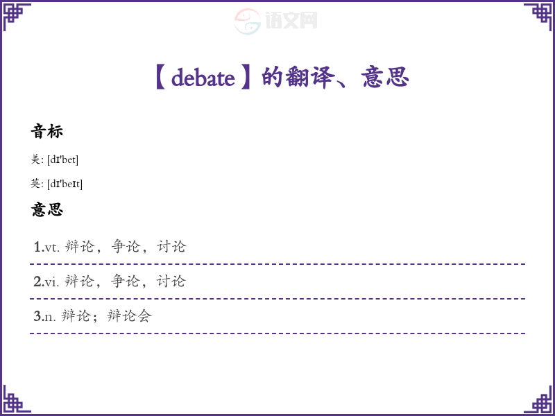 - 词性:名词(noun)和动词(verb)。作为名词时,它指一次正式的讨论或争论;作为动词时,表示参与这种讨论或争论。