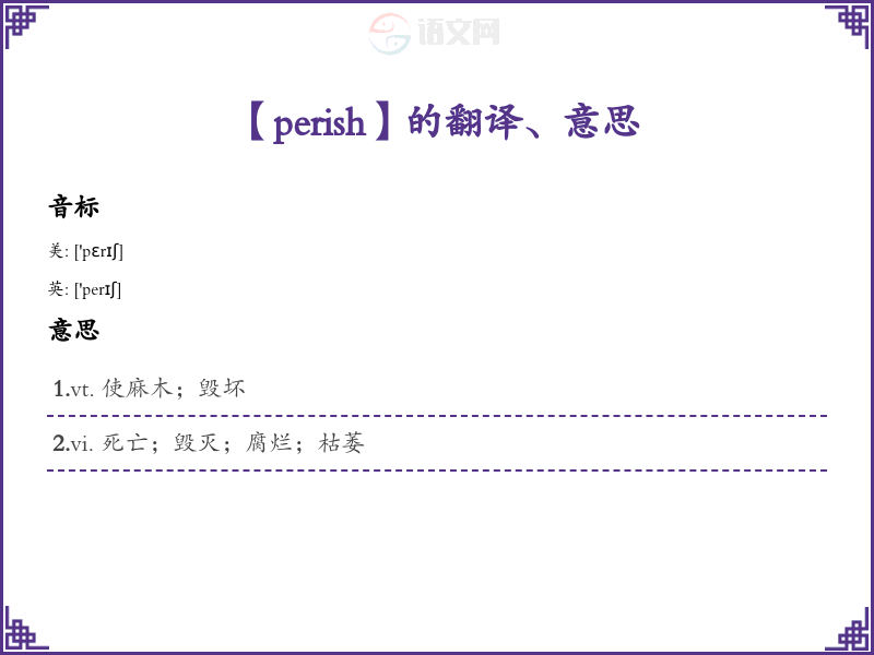 “Perish”字面意思是指“死亡”或“消亡”,通常用来描述生命的终结或事物的毁灭。 - 词性: