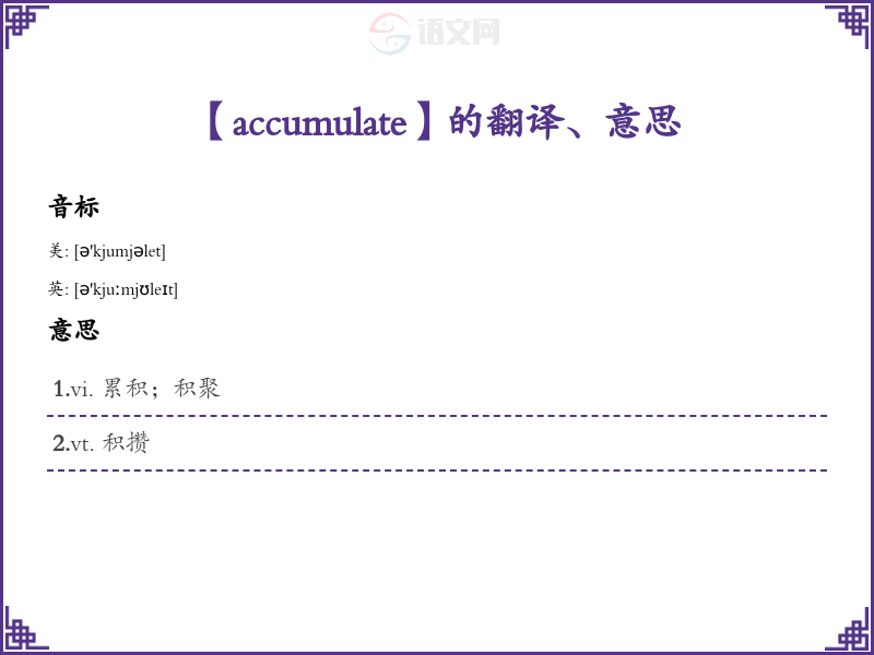 - 字面意思:字面上,“accumulate”意为“逐渐增加”或“积累”。它指的是随着时间的推移逐步获得、收集或聚集某样东西。