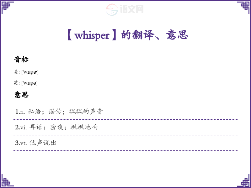 定义:Whisper是一个动词,指用非常轻柔和低的声音说话,通常是为了保密或不希望被他人听到。