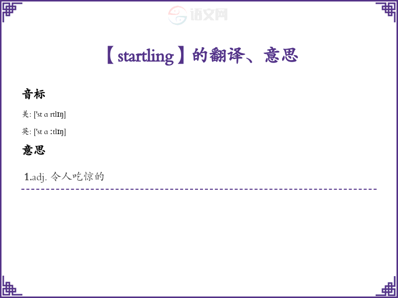 - 字面意思:Startling 的字面含义是“使人吃惊的”或“令人震惊的”。它通常用来形容某种事物或情况出乎意料,令人感到惊讶。