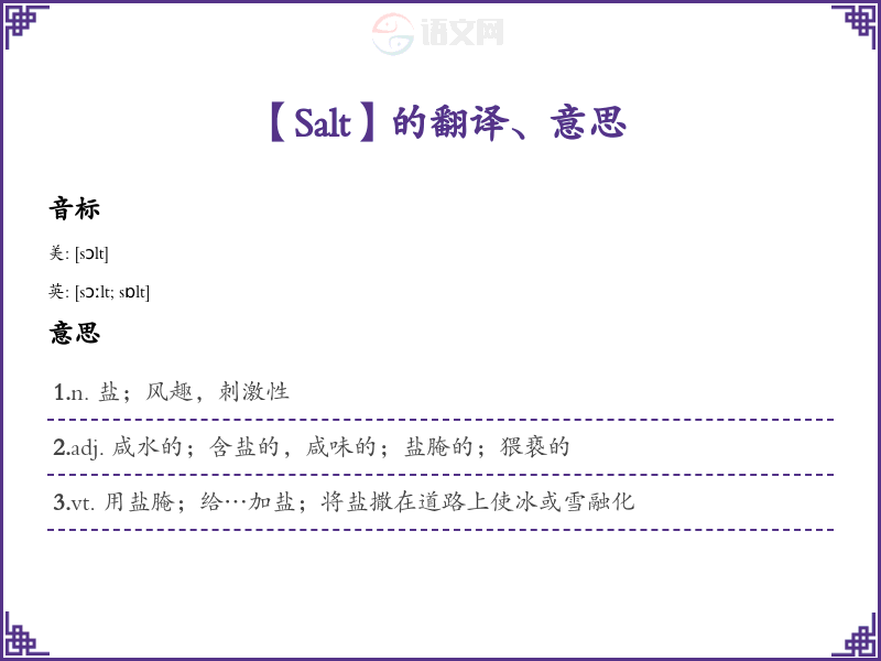 3. vt. 用盐腌;给…加盐;将盐撒在道路上使冰或雪融化
