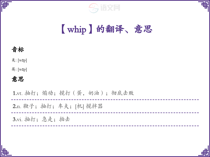- 将“whip”的发音 /wɪp/ 和“whip”这个动作联系起来,想象挥动鞭子的声音,让发音更具象化。