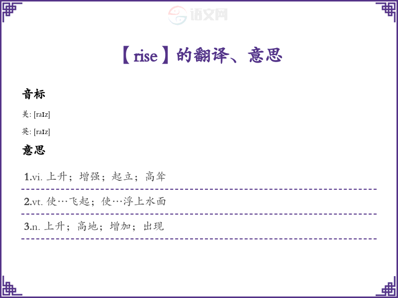 - 词性:动词(verb)和名词(noun)。作为动词时,表示“升起、增加”;作为名词时,表示“上升、增长”。