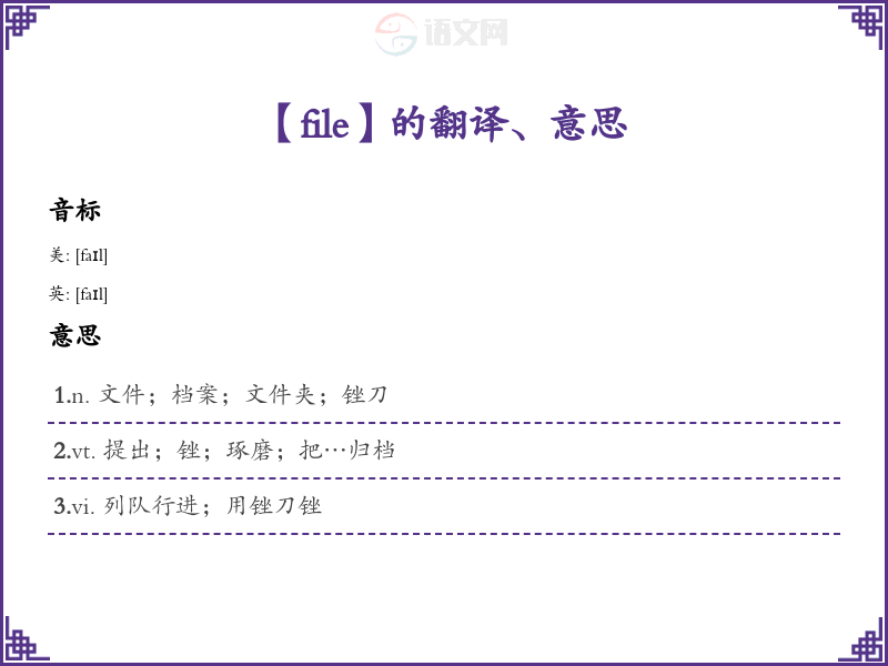 1、[N-COUNT] A file is a box or a folded piece of heavy paper or plastic in which letters or documents are kept. 文件盒; 文件夹