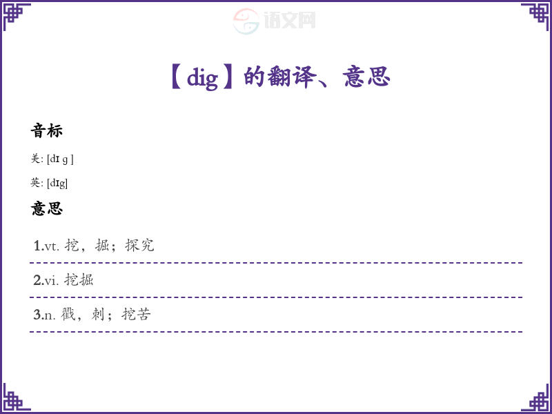 - 谐音联想记忆:可以联想“dig”与中文“挖”相似的发音,帮助记忆其意思。