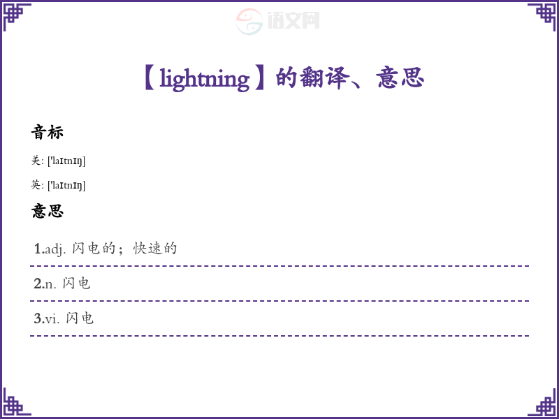 - 词根记忆法:记住“light”表示光,“ning”表示状态,结合理解“闪电是光的状态”。