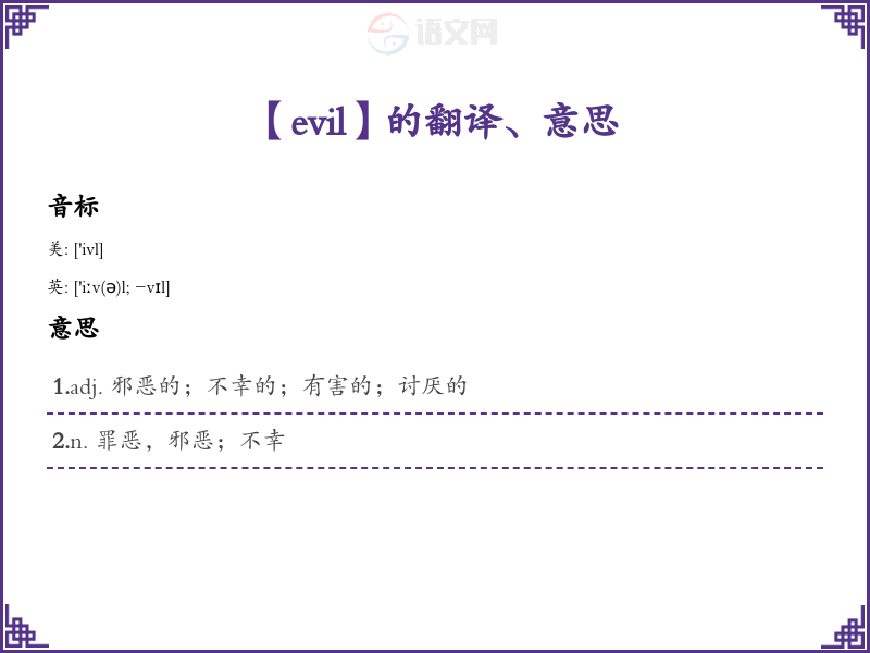 - 字面意思:'evil' 指的是一种道德上错误或邪恶的状态,通常与不道德或有害的行为相联系。